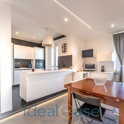 - Zona Cucina: Moderna e funzionale, si sviluppa a vista con una comoda penisola/isola centrale e mobili laccati bianchi, abbinati a rivestimenti scuri di contrasto. Dalla cucina si accede a un comodo balcone verandato, ottimamente sfruttato come zona lavanderia grazie alla presenza dell’attacco per la lavatrice.