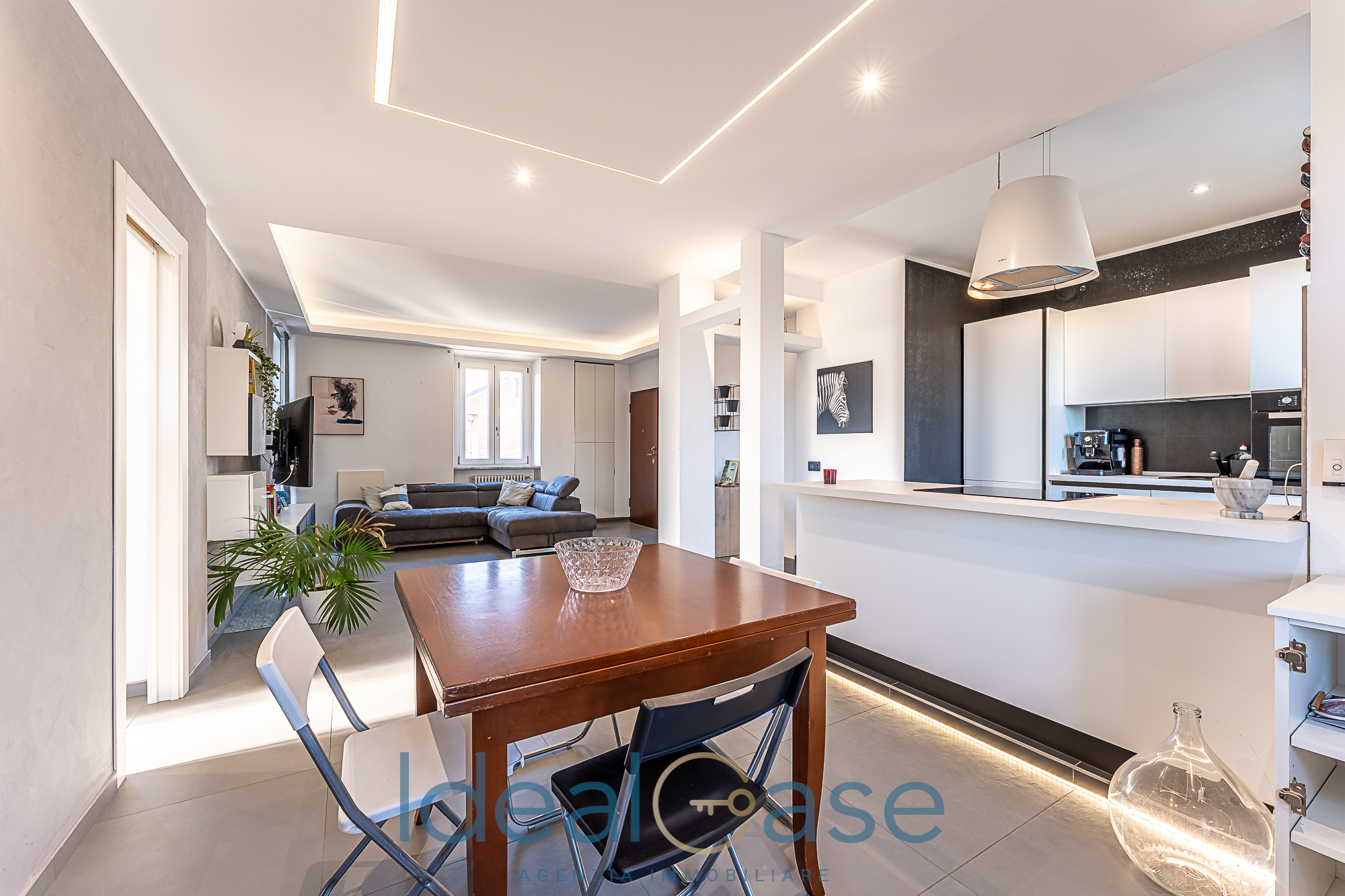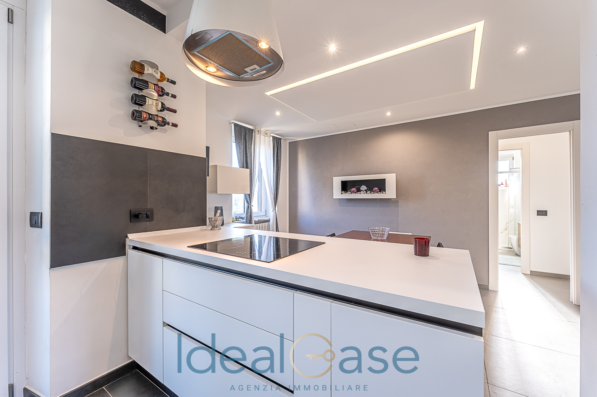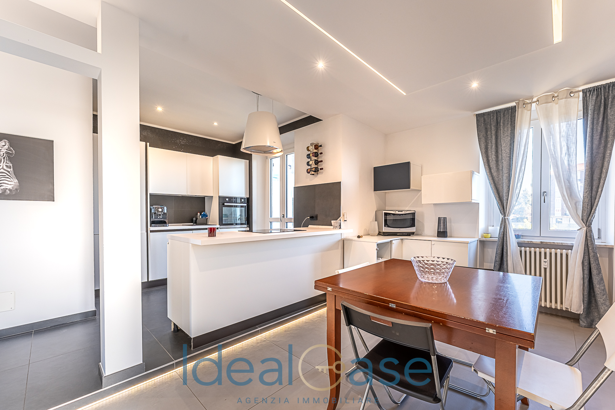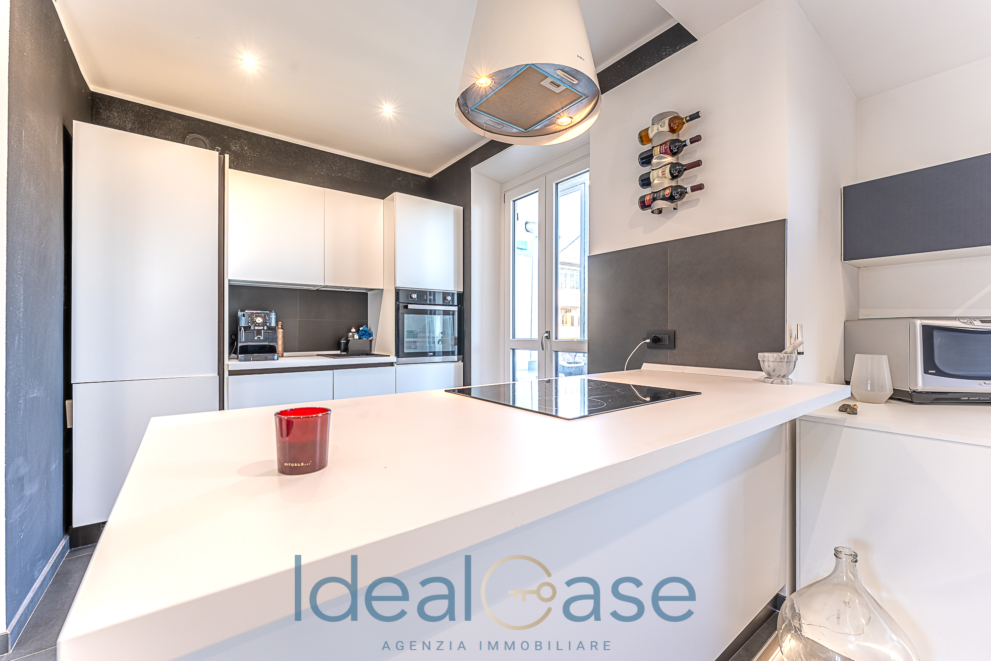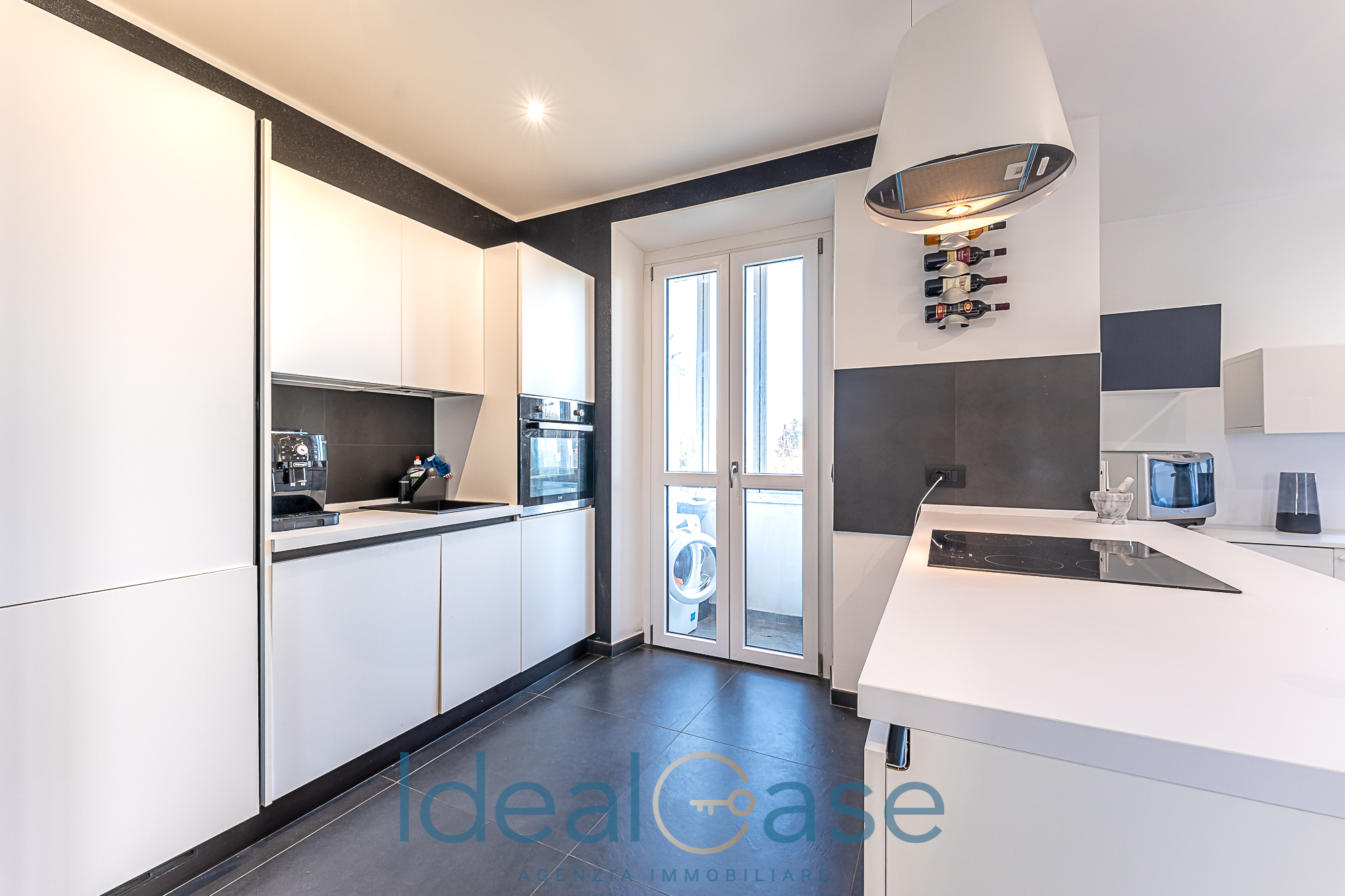 - Zona Cucina: Moderna e funzionale, si sviluppa a vista con una comoda penisola/isola centrale e mobili laccati bianchi, abbinati a rivestimenti scuri di contrasto. Dalla cucina si accede a un comodo balcone verandato, ottimamente sfruttato come zona lavanderia grazie alla presenza dell’attacco per la lavatrice.