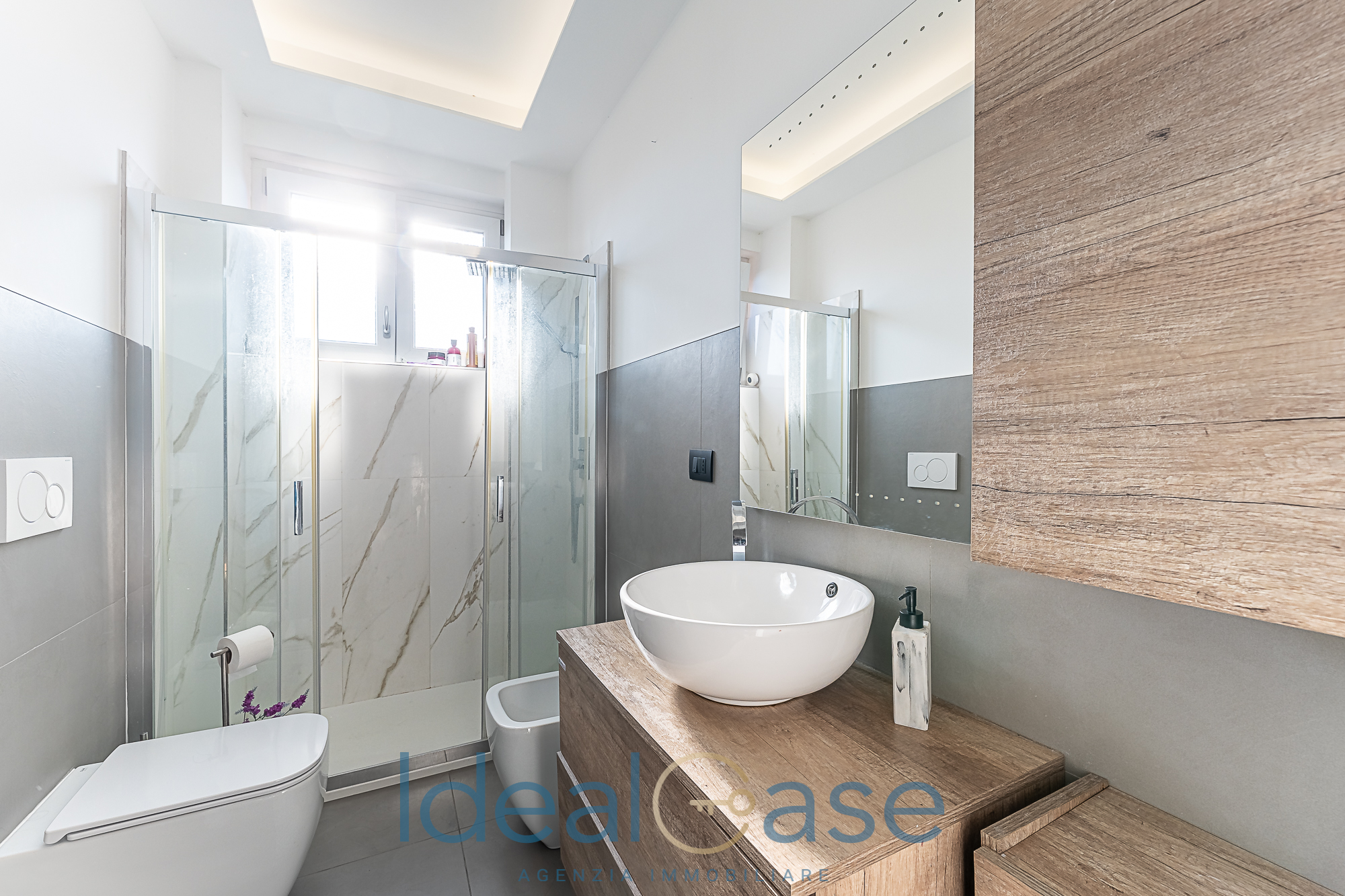 - La pavimentazione è uniforme in gres porcellanato di grande formato, mentre le pareti combinano tonalità chiare con eleganti inserti grigio/tortora.