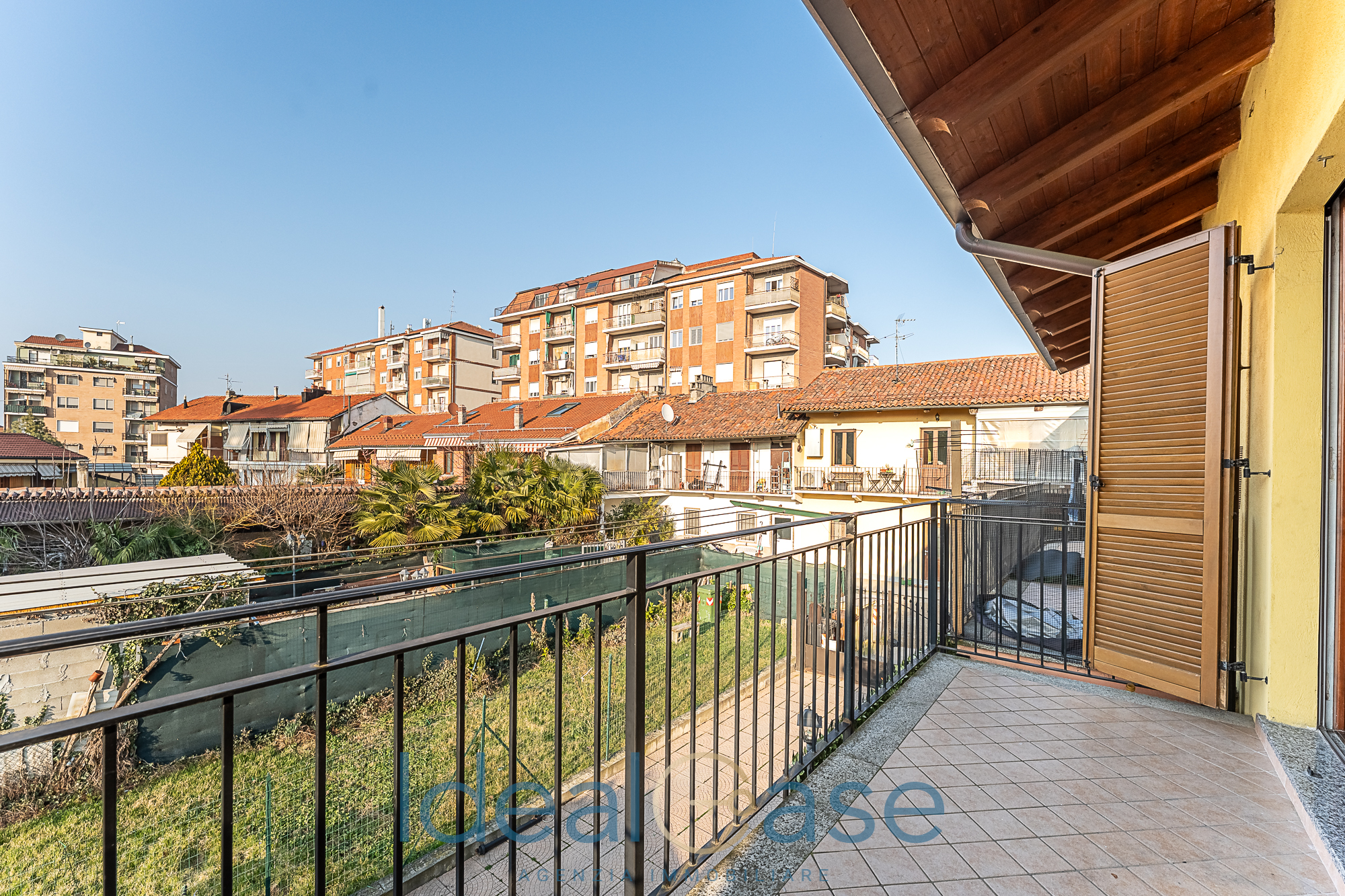 Infissi in legno con doppio vetro, persiane e pavimentazione moderna in ceramica.