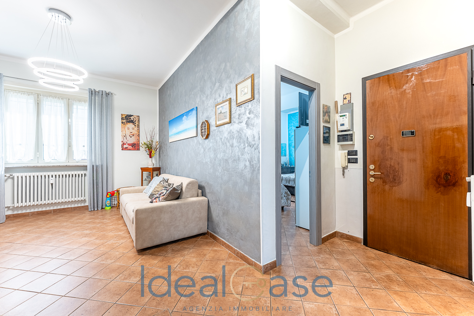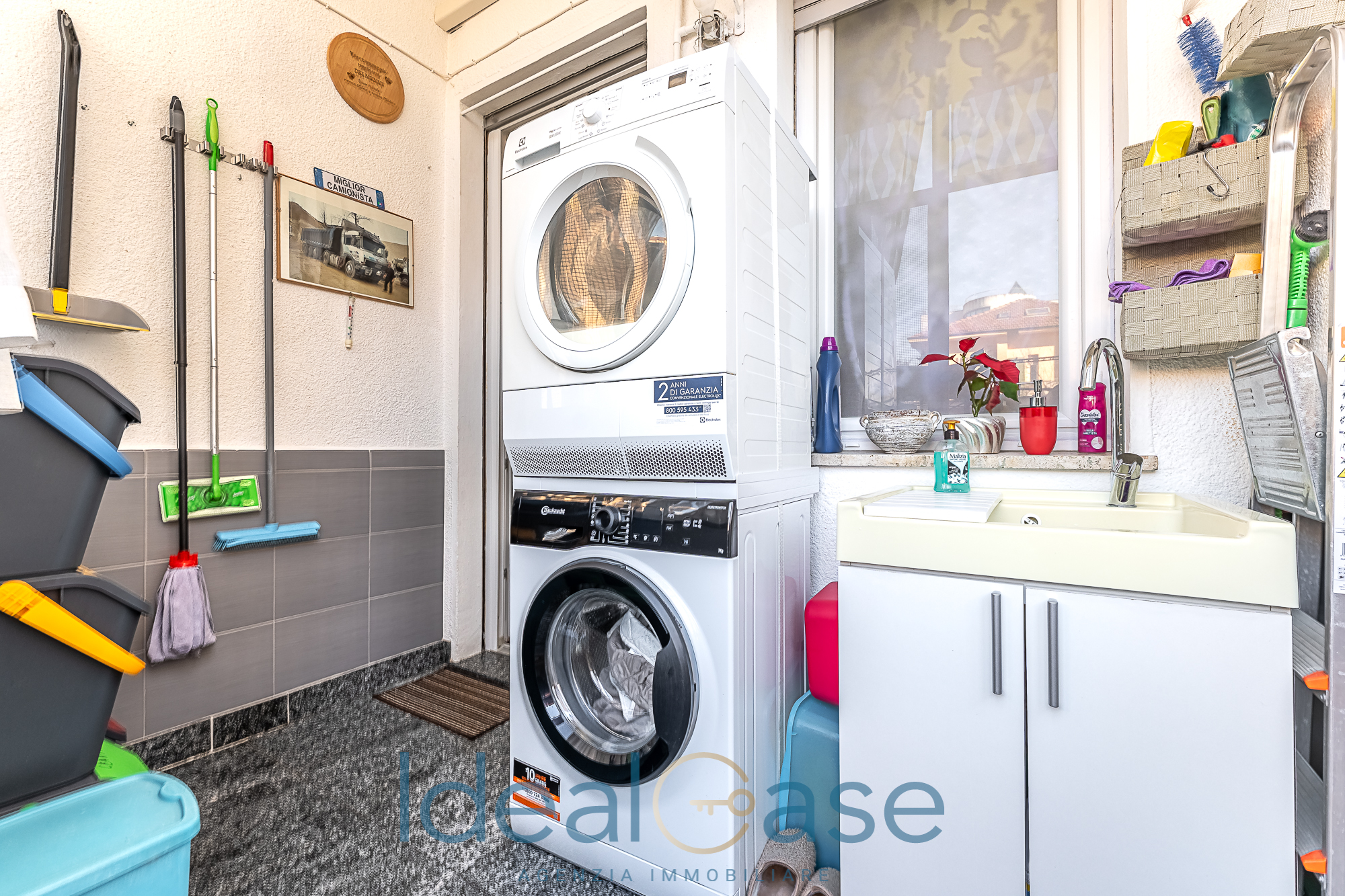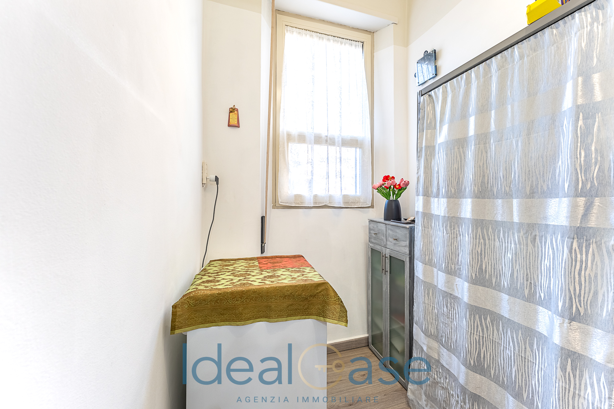 L’interno si apre su un disimpegno che conduce alla zona living con cucina abitabile e a una spaziosa camera matrimoniale. Il comfort è garantito da un pratico ripostiglio, un bagno moderno e un balcone verandato sapientemente organizzato come zona lavanderia (completo di lavabo e attacchi).